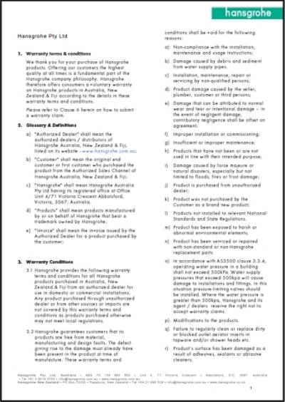 We thank you for your purchase of Hansgrohe products. Offering our customers the highest quality at all times is a fundamental part of the Hansgrohe company philosophy. Hansgrohe therefore offers consumers a voluntary warranty on Hansgrohe products in Australia, New Zealand & Fiji according to the details in these warranty terms and conditions.